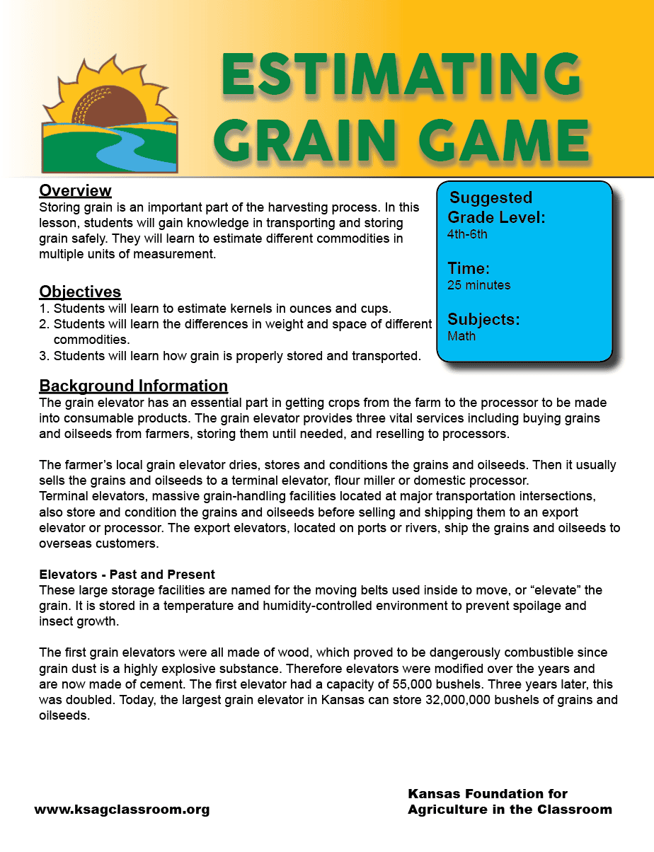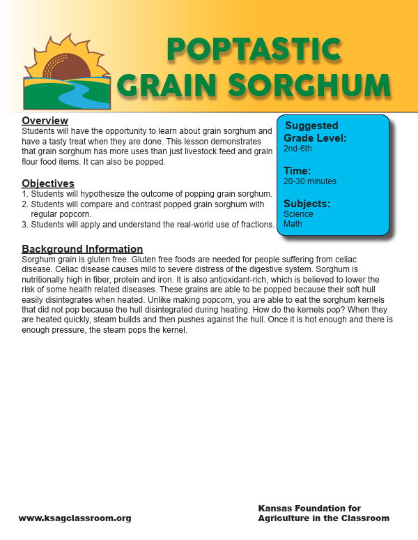 The Kansas Grain Sorghum Commission is a proud sponsor of the Kansas Foundation for Agriculture in the Classroom (KFAC), an organization dedicated to connecting Kansas agriculture to classrooms every day. For more ways to bring sorghum into your classroom, check out the lesson plans and kits below: